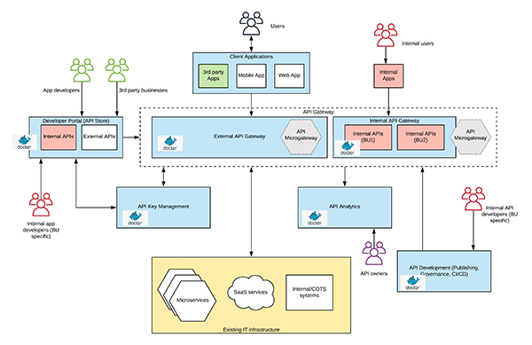 在此,我们还引入了两个分别用于API分析和API开发的附加模块。如果您想根据不同的参数,分析API的使用情况,并据此做出决断的话,那么API分析组件最合适此类需求。而API开发组件是API开发人员在构建API时需要交互的组件。它既可以基于GUI的接口,又可以与源代码管理系统、以及Jenkins之类的构建管道,绑定到完全自动化的过程中。