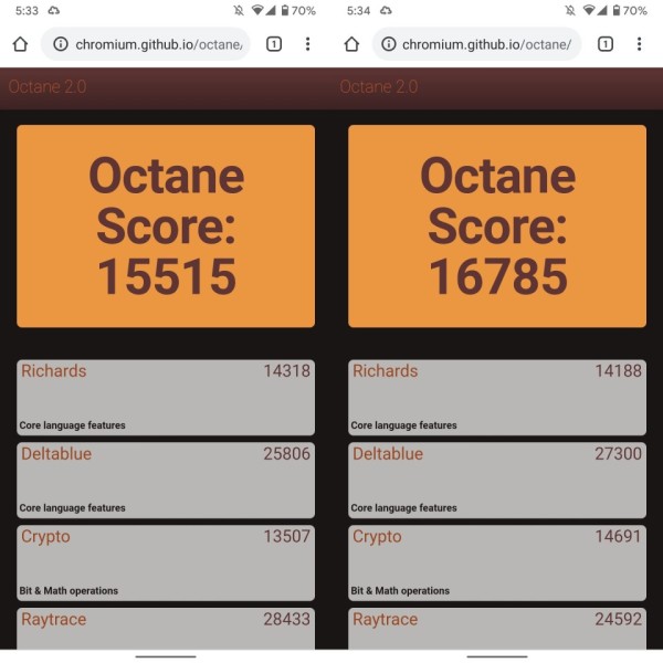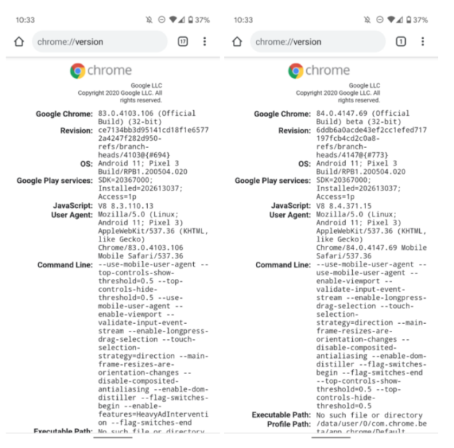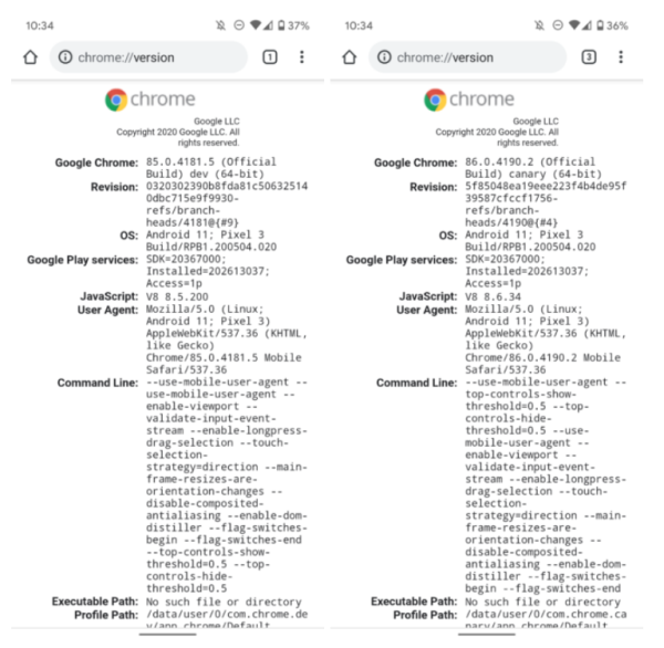 ▼ 下图: 64 位 Android 版的 Chrome 85 和 86