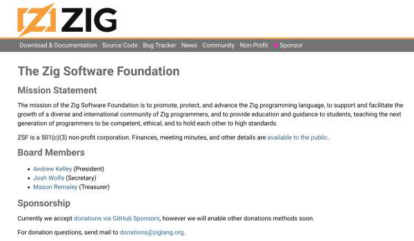 Today, I am proud to announce the Zig Software Foundation, a 501(c)(3) not-for-profit corporation, dedicated to promoting, protecting, and advancing the Zig programming language, supporting and facilitating the growth of a diverse and international community of Zig programmers, and providing education and guidance to students, teaching the next generation of programmers to be competent, ethical, and to hold each other to high standards.