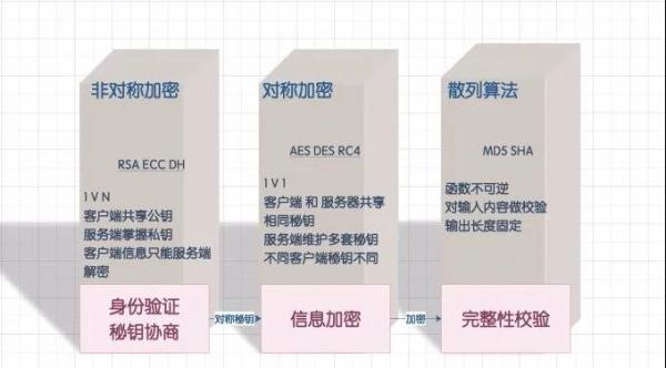HTTPS 协议的主要功能基本都依赖于 TLS/SSL 协议,TLS/SSL 的功能实现主要依赖于三类基本算法:散列函数 、对称加密和非对称加密,利用非对称加密实现身份认证和密钥协商,对称加密算法采用协商的密钥对数据加密,基于散列函数验证信息的完整性。