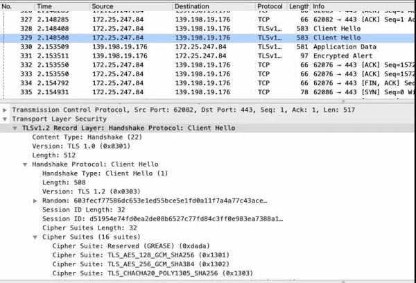 可以看到客户端发送给服务端他所支持的密码套件有 16 套之多,另外客户端使用的 TLS 版本是 1.2。