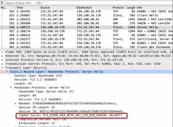 然后从客户端的列表里选一个作为本次通信使用的密码套件。在这里它选择了 Cipher Suite: TLS_ECDHE_RSA_WITH_AES_128_GCM_SHA256 (0xc02f)。