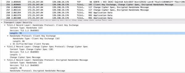 客户端向服务器发送 Client Key Exchange。最后客户端与服务器互发 Change Cipher Spec,Encrypted Handshake Message: