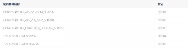 摘要算法只能用 SHA256、SHA384,密钥交换算法只有 ECDHE 和 DHE,椭圆曲线也被砍到只剩 P-256 和 x25519 等 5 种。
