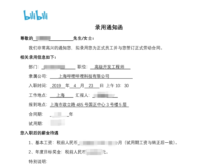 第二周上半周,B站的HR说面试通过了,和我说了薪资,比我预期的少,我说这个薪资我不能接受,HR说他会反馈给领导,看领导的意思。第二天又打电话给我,说领导同意上调了,如果没问题就发offer。我这边就同意了。当时收到邮件,还是挺高兴的,有保底的了。