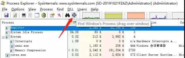 按住这个扫描图标拖放到对应的窗口,进程列表将自动定位到对应的进程,接下来就好好收拾这个“坏蛋”吧!
