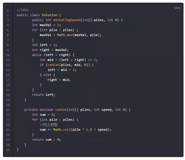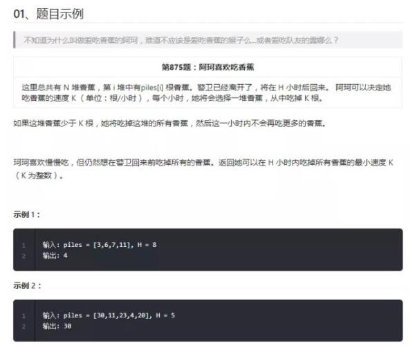 在这本算法题典中,作者对一些经典算法做了讲解。讲解的形式是首先给出一道应用该算法的题目,比如,在二分法系列的第一节中,作者以一道「爱吃香蕉的珂珂」引入: