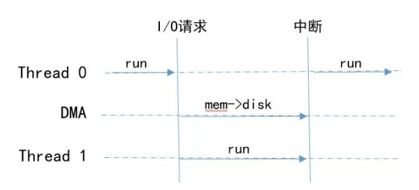 Thread0收到I/O请求,将请求转发给DMA,DMA执行请求