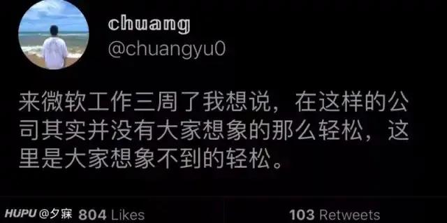 微软中国一直践行着“工作生活平衡”的职场信条。一位新入职微软的员工曾在虎扑上戏谑地写道,“来微软工作三周了,我想说,在这样的公司其实没有大家想象的那么轻松,这里是大家想象不到的轻松。”