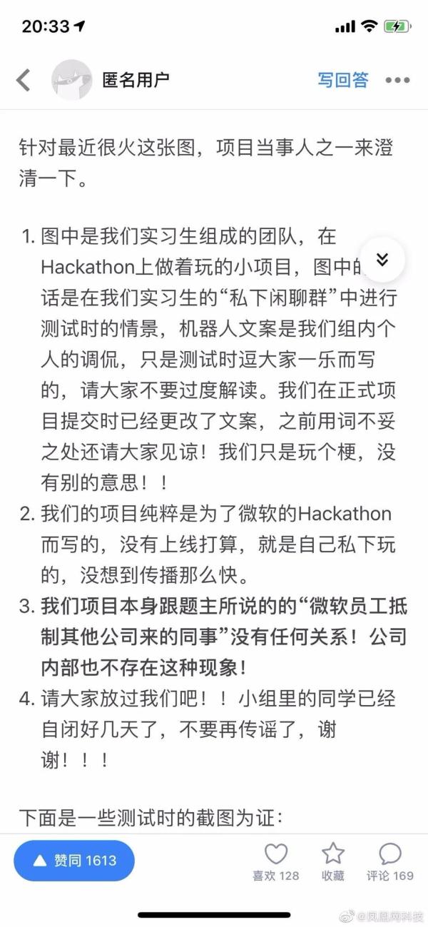 项目当事人之一澄清表示:图中是我们实习生组成的团队,在 Hackathon 上做着玩的小项目,图中的对话是在我们实习生的“私下闲聊群”中进行测试时的情景,机器人文案是我们组内个人的调侃,只是测试时逗大家一乐而写的,请大家不要过度解读。