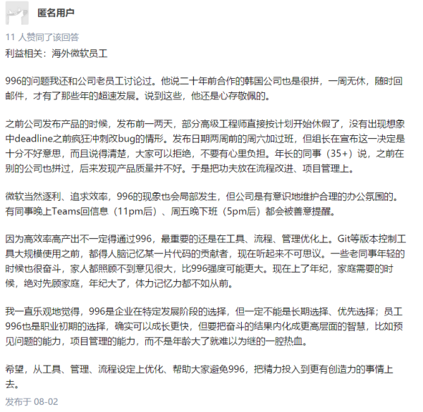 利益相关:海外微软员工。996 的问题我还和公司老员工讨论过。他说二十年前合作的韩国公司也是很拼,一周无休,随时回邮件,才有了那些年的超速发展。说到这些,他还是心存敬佩的。