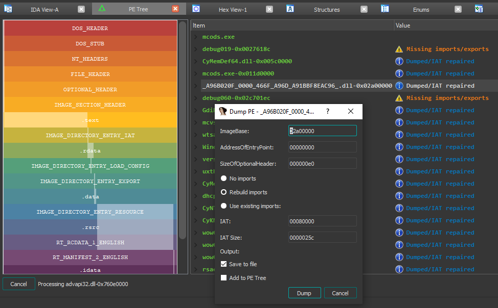 PE Tree 还与 HexRays 的IDA Pro 反编译器集成在一起,从而可以轻松导航 PE 结构,以及转储内存中的 PE 文件并执行导入重建, 在识别和阻止各种恶意软件方面至关重要。