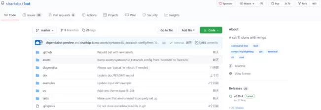其实,它是cat命令的克隆,有很多很酷的功能,例如语法高亮,git集成和自动分页等。目前,bat在Github上标星21.7K,累计分支463(Github地址:https://github.com/sharkdp/bat)