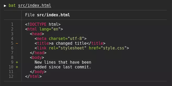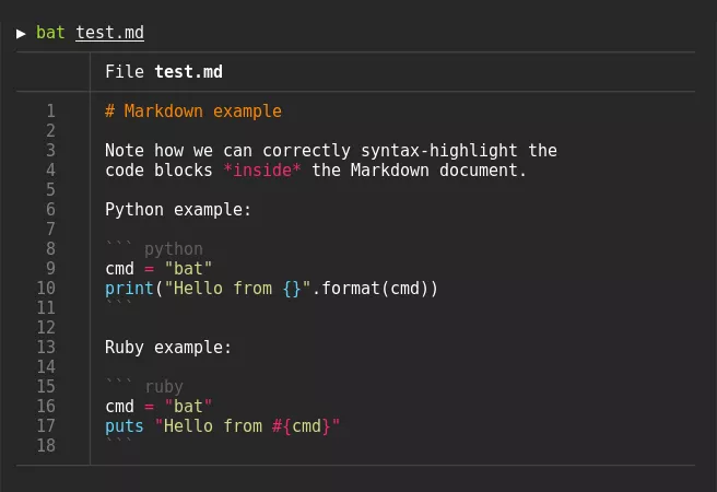 bat > note.md # quickly create a new file bat header.md content.md footer.md > document.md bat -n main.rs # show line numbers (only) bat f - g # output 'f', then stdin, then 'g'.