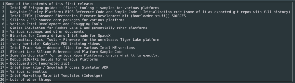 根据曝光者梳理,目前已公开的部分主要为 Lake 系列处理器相关内容,还包括 Kaby Lake BIOS 源码、Intel 为 Space X 开发的相机驱动、Rocket Lake S 模拟材料、Elkhart Lake 参考代码等,具体如下:
