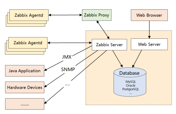 Database:用于存储配置信息以及采集到的数据,支持 MySQL、Oracle 等关系型数据库。同时,最新版本的 Zabbix 已经开始支持时序数据库,不过成熟度还不高。