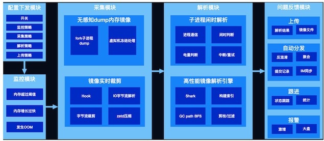 快手KOOM核心流程包括:配置下发决策、监控内存状态、采集内存镜像、解析镜像文件(以下简称hprof)生成报告并上传、问题聚合报警与分配跟进。