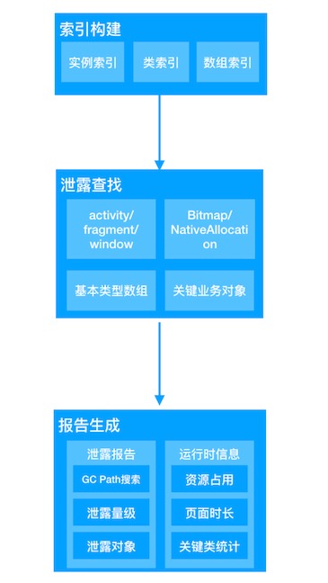 分析报告生成流程总体分为三个环节,第一个环节扫描镜像构建索引,建立泄露查找分析的基础;第二个环节查找出泄露的对象,根据既有的framework知识以及人为设定的策略,执行对象泄露判定;第三个环节生成最终报告文件,将对象泄露路径、泄露数量、类统计、运行时信息添加至报告文件,辅助后续根据报告分析解决OOM问题。