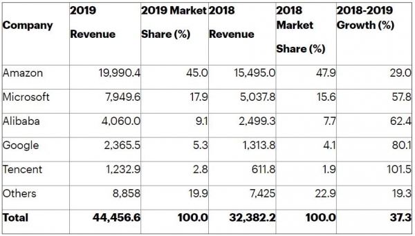 根据Gartner的统计数据,2019年全球基础设施即服务(IaaS)市场增长了37.3%,达到445亿美元,高于2018年的324亿美元。2019年Amazon在IaaS市场上排名第一,其次是微软、阿里巴巴、谷歌和腾讯。