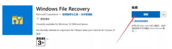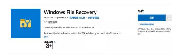首先,通过下载链接打开“Windows File Recovery”的下载界面,点击“获取”按钮安装。(下载地址:https://www.microsoft.com/zh-cn/p/windows-file-recovery/9n26s50ln705?activetab=pivot:overviewtab)