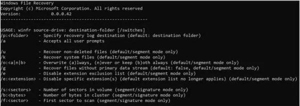 安装完成之后,我们再来说说Windows File Recovery的具体用法,Windows File Recovery支持三种恢复模式,分别是:默认模式、分段(segment mode)、签名(signature mode)。