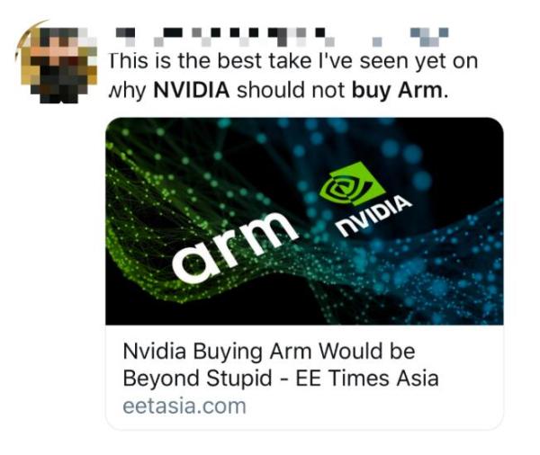 一位外国网友发表了一篇文章,称英伟达对Arm的收购十分「不明智」。「他们可能有一个Nvidia-Arm组合的愿景。不过,首先,他们不得不克服一系列的监管障碍。」