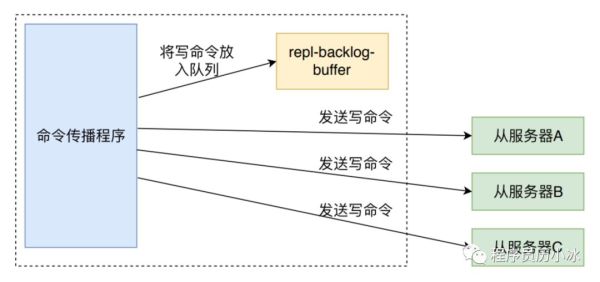 int expireIfNeeded(redisDb *db, robj *key) { // 获取键的过期时间 mstime_t when = getExpire(db,key); mstime_t now; // 键没有过期时间 if (when < 0) return 0; // 实例正在从硬盘 laod 数据,比如说 RDB 或者 AOF if (server.loading) return 0; // 当执行lua脚本时,只有键在lua一开始执行时 // 就到了过期时间才算过期,否则在lua执行过程中不算失效 now = server.lua_caller ? server.lua_time_start : mstime(); // 当本实例是slave时,过期键的删除由master发送过来的 // del 指令控制。但是这个函数还是将正确的信息返回给调用者。 if (server.masterhost != NULL) return now > when; // 判断是否未过期 if (now <= when) return 0; // 代码到这里,说明键已经过期,而且需要被删除 server.stat_expiredkeys++; // 命令传播,到 slave 和 AOF propagateExpire(db,key,server.lazyfree_lazy_expire); // 键空间通知使得客户端可以通过订阅频道或模式, 来接收那些以某种方式改动了 Redis 数据集的事件。 notifyKeyspaceEvent(NOTIFY_EXPIRED, "expired",key,db->id); // 如果是惰性删除,调用dbAsyncDelete,否则调用 dbSyncDelete return server.lazyfree_lazy_expire ? dbAsyncDelete(db,key) : dbSyncDelete(db,key); }上图是写命令传播的示意图,删除命令的传播和它一致。propagateExpire 函数先调用 feedAppendOnlyFile 函数将命令同步到 AOF 的缓冲区中,然后调用 replicationFeedSlaves函数将命令同步到所有的 slave 中。Redis 复制的机制可以查看Redis 复制过程详解。