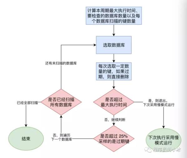5)未超时的话,则判断是否采样的键中是否有25%的键是过期的,如果是则继续扫描当前数据库,跳到第3步。否则开始扫描下一个数据库。