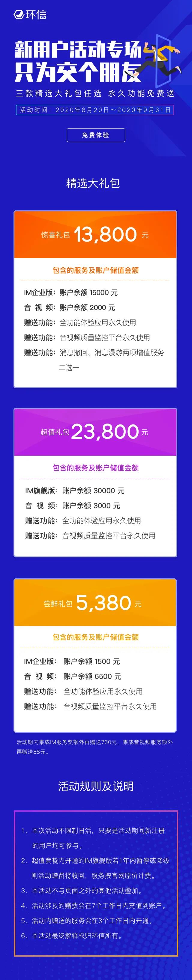 金秋九月、金九银十,环信新用户活动专场大幕拉开。环信IM+音视频云三款精选大礼包任意选,近十种增值功能永久免费体验(包括:多端多设备同步、消息回调、消息撤回、消息漫游、敏感词过滤、智能反垃圾、音视频服务等);秋天是一个收获的季节,只为交个朋友!!!