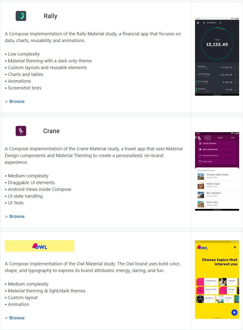 除了以上这些应用实例之外,还有Crane(旅行应用程序)、Rally(财务应用程序)、Owl等具有特色的应用程序,如果你对Compose感兴趣,这个项目一定要去看看。