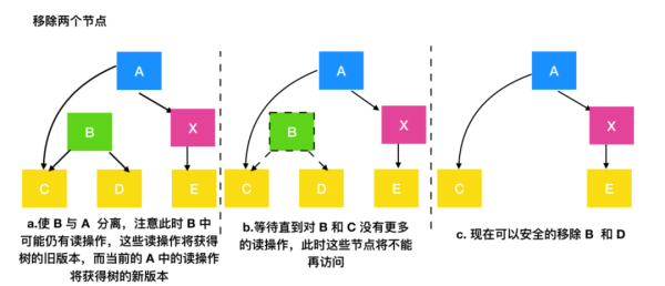 在上面的图中,我们接着移除 B 和 D。首先,将 A 的左子节点指针指向 C 。所有原本在 A 中的读操作将会后续读到节点 C ,而永远不会读到 B 和 D。也就是说,它们将只会读取到新版数据。同样,所有当前在 B 和 D 中的读操作将继续按照原始的数据结构指针并且读取旧版数据。所有操作均能正确运行,我们不需要锁住任何东西。而不需要锁住数据就能够移除 B 和 D 的主要原因就是 读-复制-更新(Ready-Copy-Update,RCU),将更新过程中的移除和再分配过程分离开。