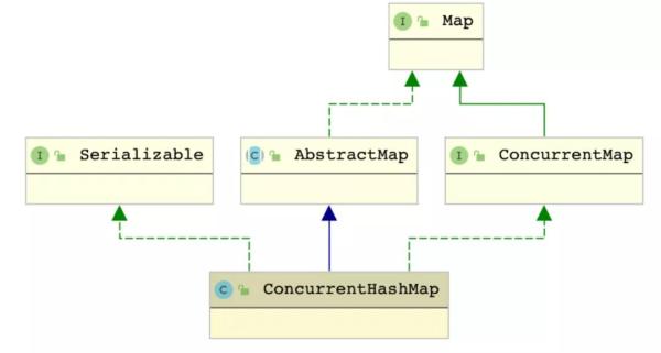 可以看到,ConcurrentHashMap 继承了 AbstractMap 接口并实现了 ConcurrentMap 和 Serializable 接口,AbstractMap 和 ConcurrentMap 都是 Map 的实现类,只不过 AbstractMap 是抽象实现。