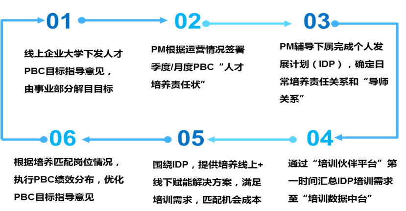 通过实践我们借鉴了“海尔大学”的PBC个人事业绩效承诺(Personal Business Commitment)和IDP个人发展计划(Individual Development Plan)相结合的制度设计(图1)。PM需签署“人才培养责任状”从绩效层面引导运营负责人主动关注团队建设、下属培育和线上经验的萃取、输出,通过拉动PM经验传承,支持干部人才的培养和储备;学员和其直线经理通过线上平台,共同确认的个人发展计划,明确培养责任、辅导责任、成本责任,从“无偿式赋能”到“责任式赋能”和“契约式赋能”转换,绩效层面保障人才的培养和学员技能的提升。