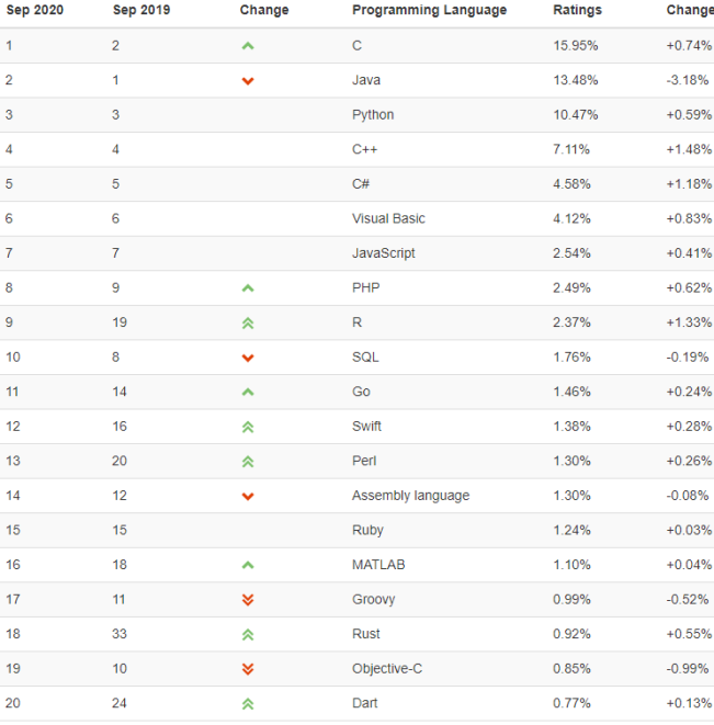 TIOBE已公布2020年9月的编程语言排行榜。C语言依然排行第一了,随后分别是Java、Python、C++、C#。前20名排行如下: