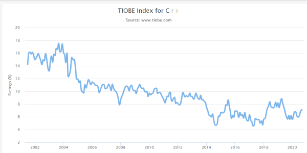 现在的C++如果和去年相比,现在就是软件包中增长最快的编程语言(增长1.48%),TIOBE CEO Paul Jansen表示,新的C++ 20标准可能是造成这种形势的主要原因之一,因为新的模块功能,将取代include机制。从这一点上看,C++打败了R语言(增长1.33%)和C#(增长1.18)