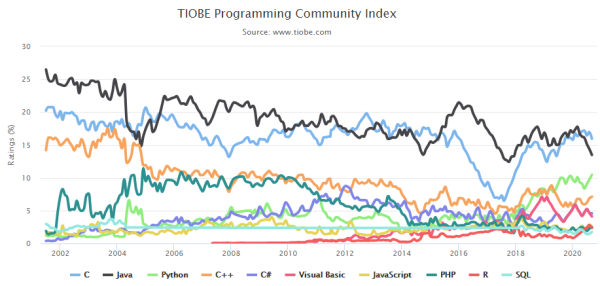 Top 10 编程语言 TIOBE 指数走势(2002-2020)