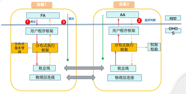 如何降低开发难度?例如,两个运行鸿蒙OS的设备,可以通过物理层连接(如蓝牙连接),物理层连接是双方通信的最终通信线路,两个设备连接之后,往上是软件层,两个设备在软件层面虚拟的连接到一条总线,可以通过这条软总线在两个设备之间非常快速地进行通讯。软总线上层是鸿蒙提供的分布式执行框架,它可以允许我们通过软总线连接不同的设备。再上面一层是鸿蒙系统提供的用户程序框架,是给应用开发者提供的标准的、统一的调用接口。应用开发者调用鸿蒙提供用户程序框架,可以使两个设备的APP进行互动,实现智能互联。此外,通过标准化,各种设备可以自动连接在一起,因此可以降低适配成本。