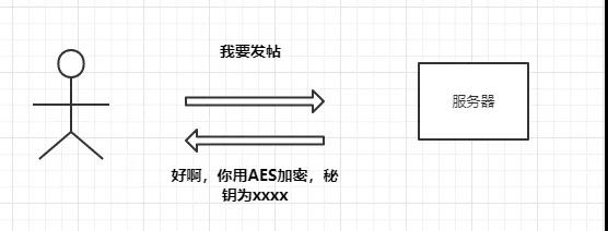 这个时候可能就有人想到了,既然内容是明文那我使用对称加密的方式将报文加密这样中间人不就看不到明文了吗,于是如下改造: