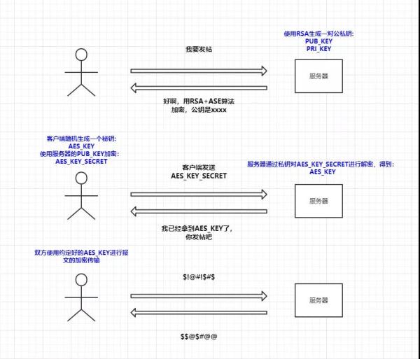 在约定加密方式的时候由服务器生成一对公私钥,服务器将公钥返回给客户端,客户端本地生成一串秘钥(AES_KEY)用于对称加密,并通过服务器发送的公钥进行加密得到(AES_KEY_SECRET),之后返回给服务端。