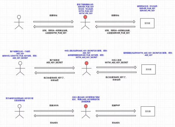 所谓道高一尺魔高一丈,中间人为了对应这种加密方法又想出了一个新的破解方案,既然拿不到 AES_KEY,那我就把自己模拟成一个客户端和服务器端的结合体。