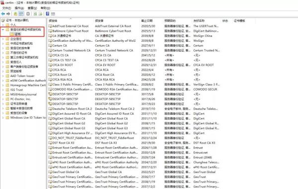 权威认证机构 在 CA 认证体系中,所有的证书都是由权威机构来颁发,而权威机构的 CA 证书都是已经在操作系统中内置的,我们把这些证书称之为CA根证书: