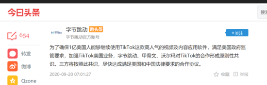 北京时间9月20日上午7时左右,字节跳动宣布,为了美国的1亿用户可以继续使用TikTok,和字节跳动、甲骨文、沃尔玛对TikTok的合作形成原则性共识。 三方将按照此共识,尽快达成满足美国和中国法律要求的合作协议。