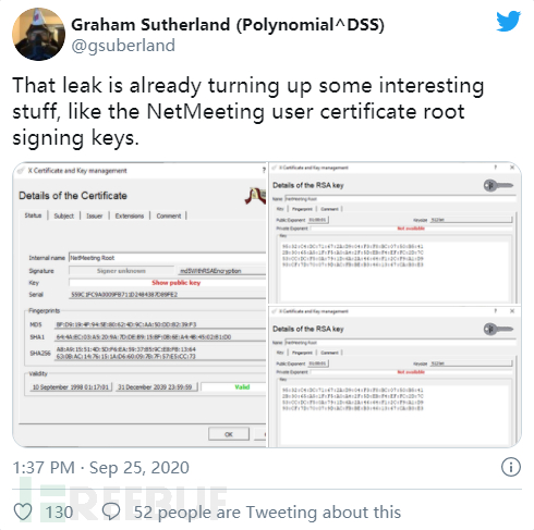 一位Windows内部专家称已经在其中找到了微软的NetMeeting用户证书根签密钥。