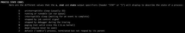 LINUX 2.6以后的内核中,进程一般存在7种基础状态:D-不可中断睡眠、R-可执行、S-可中断睡眠、T-暂停态、t-跟踪态、X-死亡态、Z-僵尸态,这几种状态在PS命令中有对应解释。