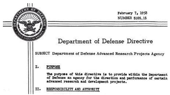 在1958 年2月7日,美国国防部长尼尔 · 麦克尔罗伊发布了国防部 5105.15 号指令,建立了高级研究计划局(ARPA) 。