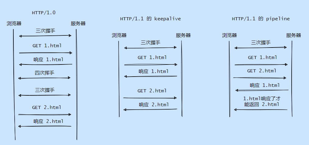 因此提出了 HTTP/1.1 ,主要是为了解决性能的问题,包括支持持久连接、pipeline、缓存管理等等,也添加了一些特性。