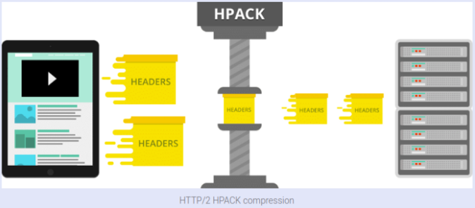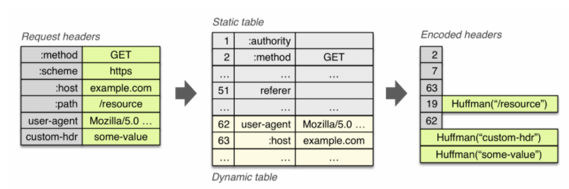 HPACK 压缩头部,采用了静态表、动态表和哈夫曼编码,在客户端和服务器都维护请求头的列表,所以只需要增量和压缩过的头部信息,服务端拿到之后组装一下就能得到完整的头部信息。