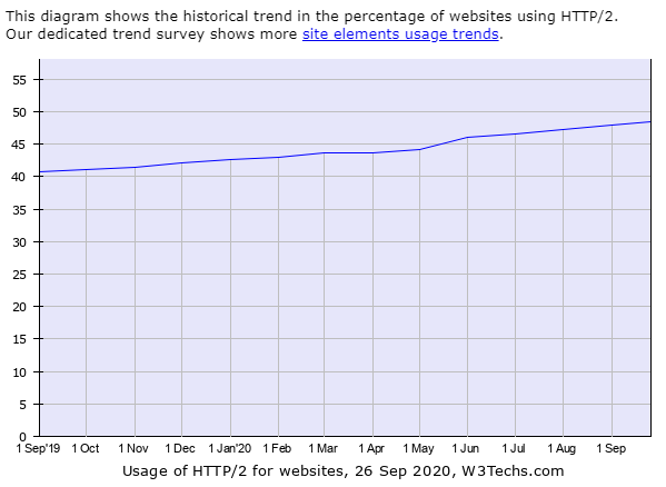 最终结果是好的,Google 后来放弃了 SPDY ,拥抱标准,而 HTTP/1.1 这个历史包袱太重了,所以 HTTP/2 到现在也只有大致一半的网站使用它。