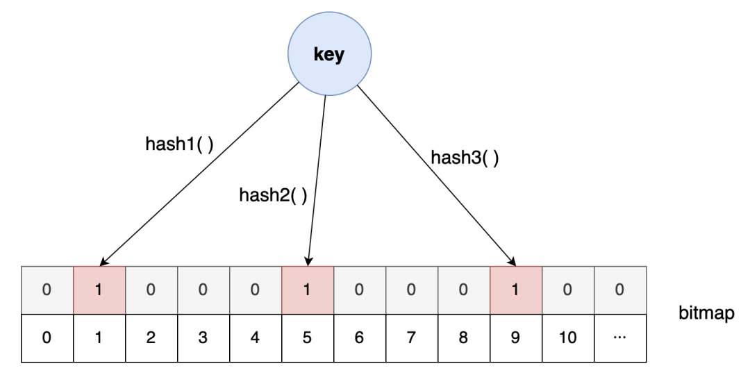 当设置对应的key-value时,按照一组哈希算法的计算,将对应比特位置1。