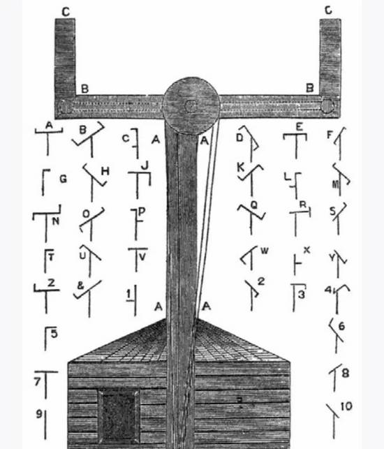 有意思的是,最早的电报装置和电一点关系都没有,是靠机械和人眼传递和接收信息,被称作观感电报。它的缺陷显而易见,能否看清编码受自然天气和光线的影响,一旦视线受阻就难以传播。